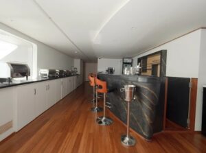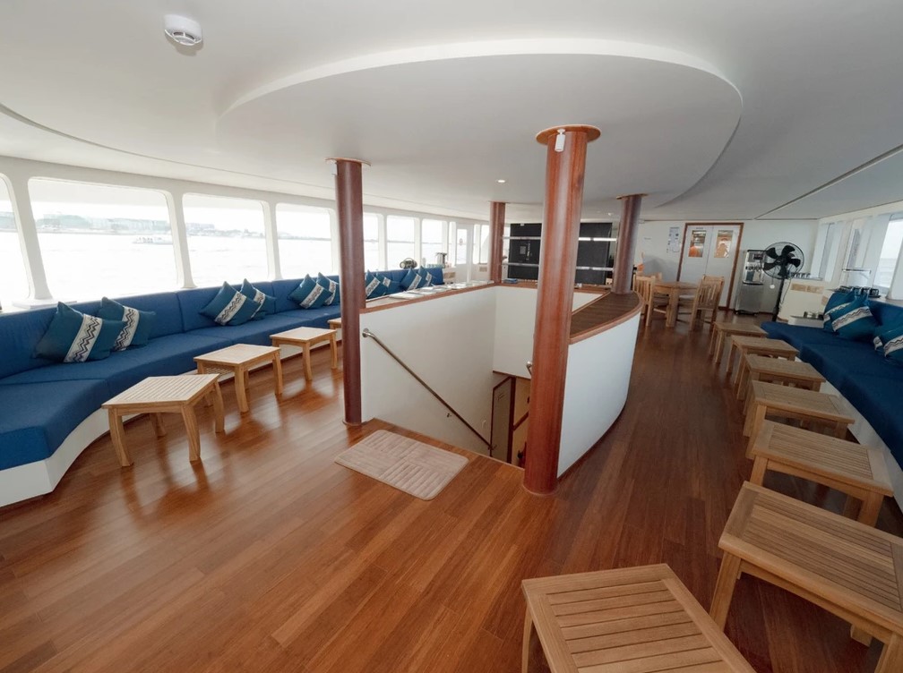 Na jachcie znajduje się restauracja, w której serwowane są posiłki międzynarodowe i lokalne, przygotowywane z organicznych składników.